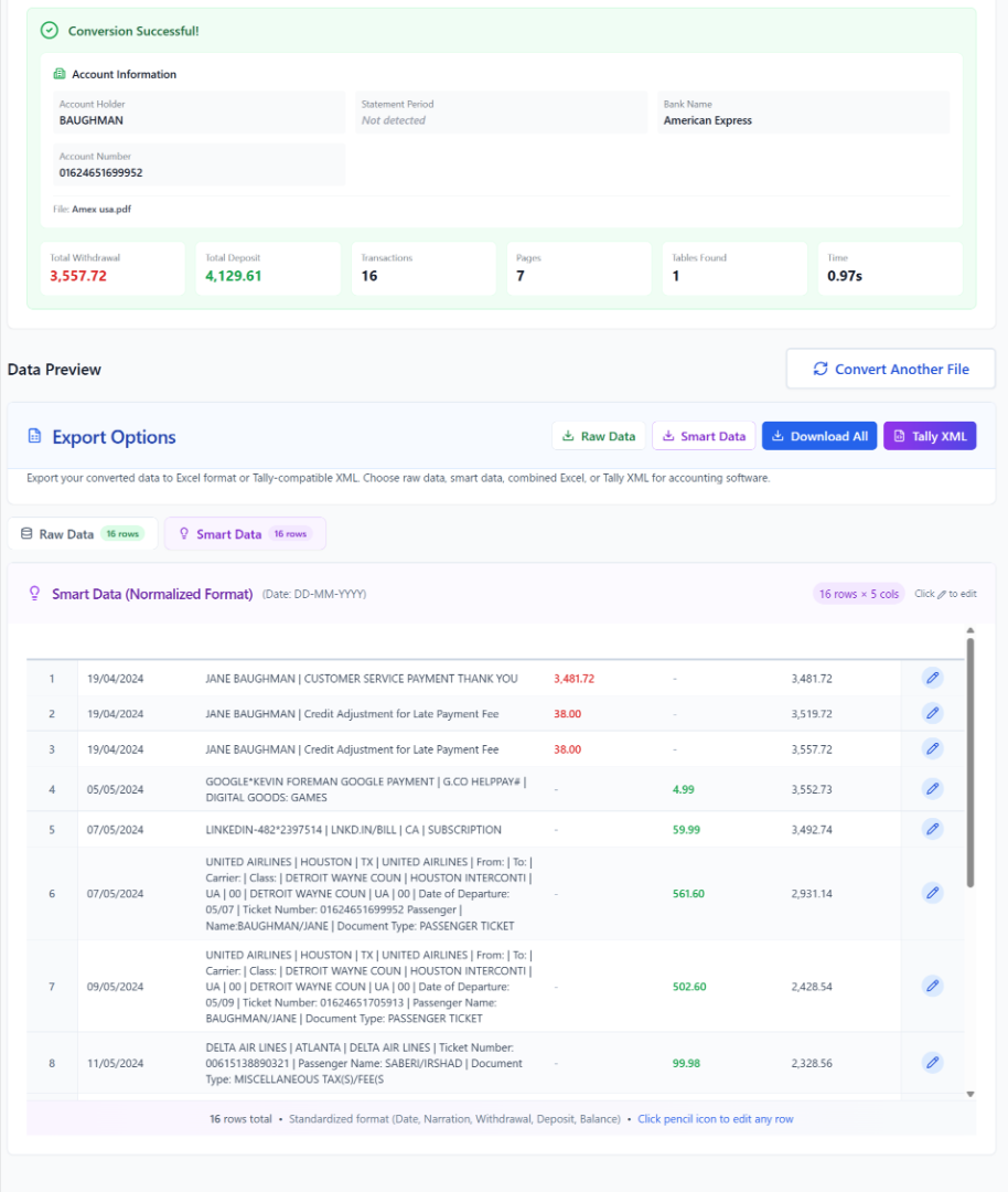 Step 4: Click on the raw data and smart data tab. The file is processed, and you can edit any transaction by clicking the pencil button.